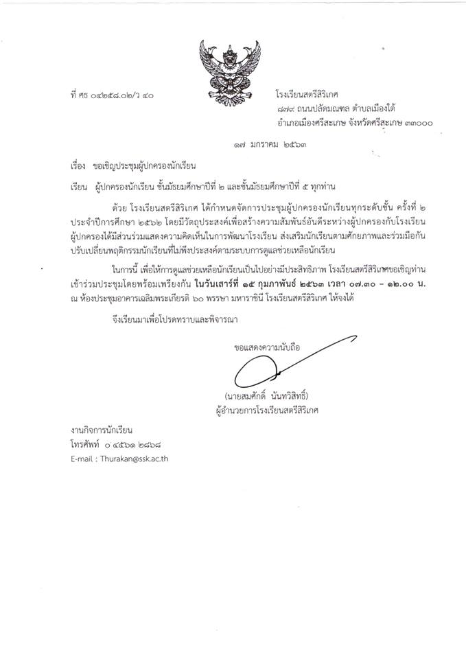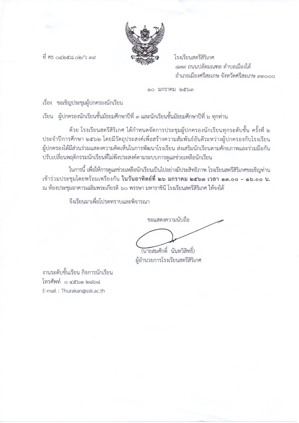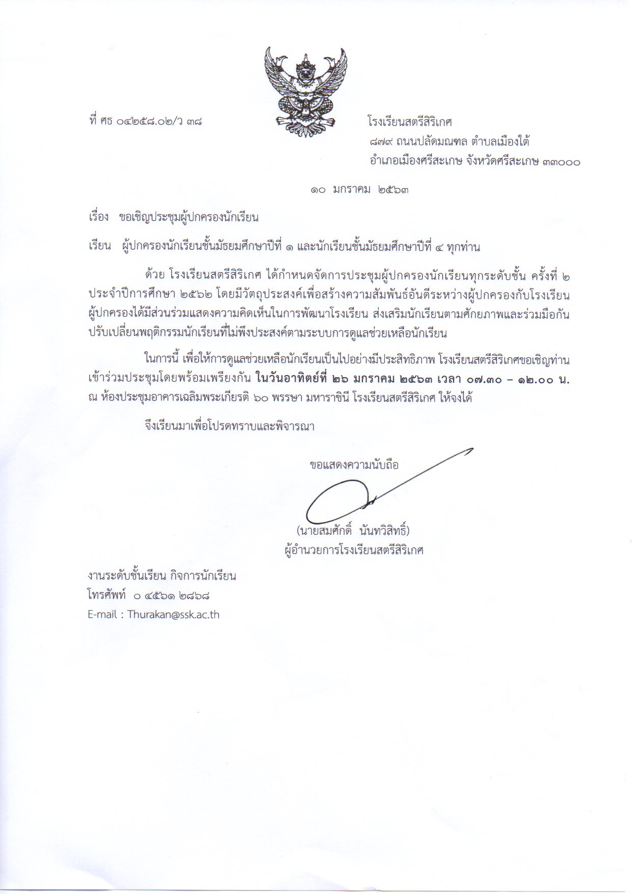 โรงเรียนสตรีสิริเกศ 879 ถนนปลัดมณฑล ตำบลเมืองใต้ อำเภอเมือง จังหวัดศรีสะเกษ 33000 โทรศัพท์ 045-612868 โทรสาร 045-620642 Email : satreesiriket@ssk.ac.th