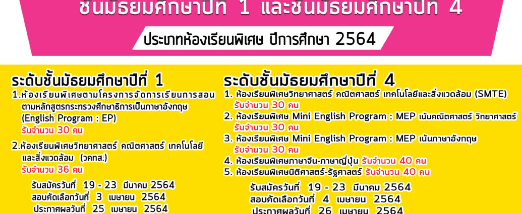 ประกาศการรับสมัครนักเรียนเข้าศึกษาต่อ ระดับชั้น ม.1 และ ม.4 ประเภทห้องเรียนพิเศษ