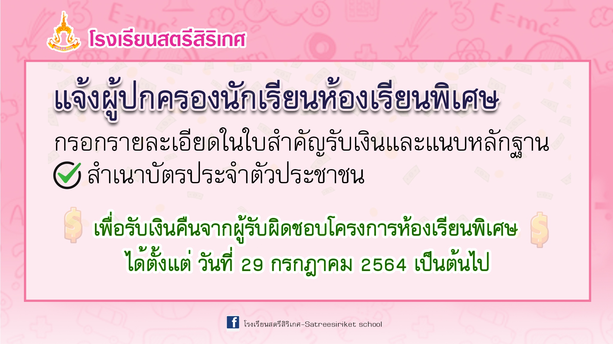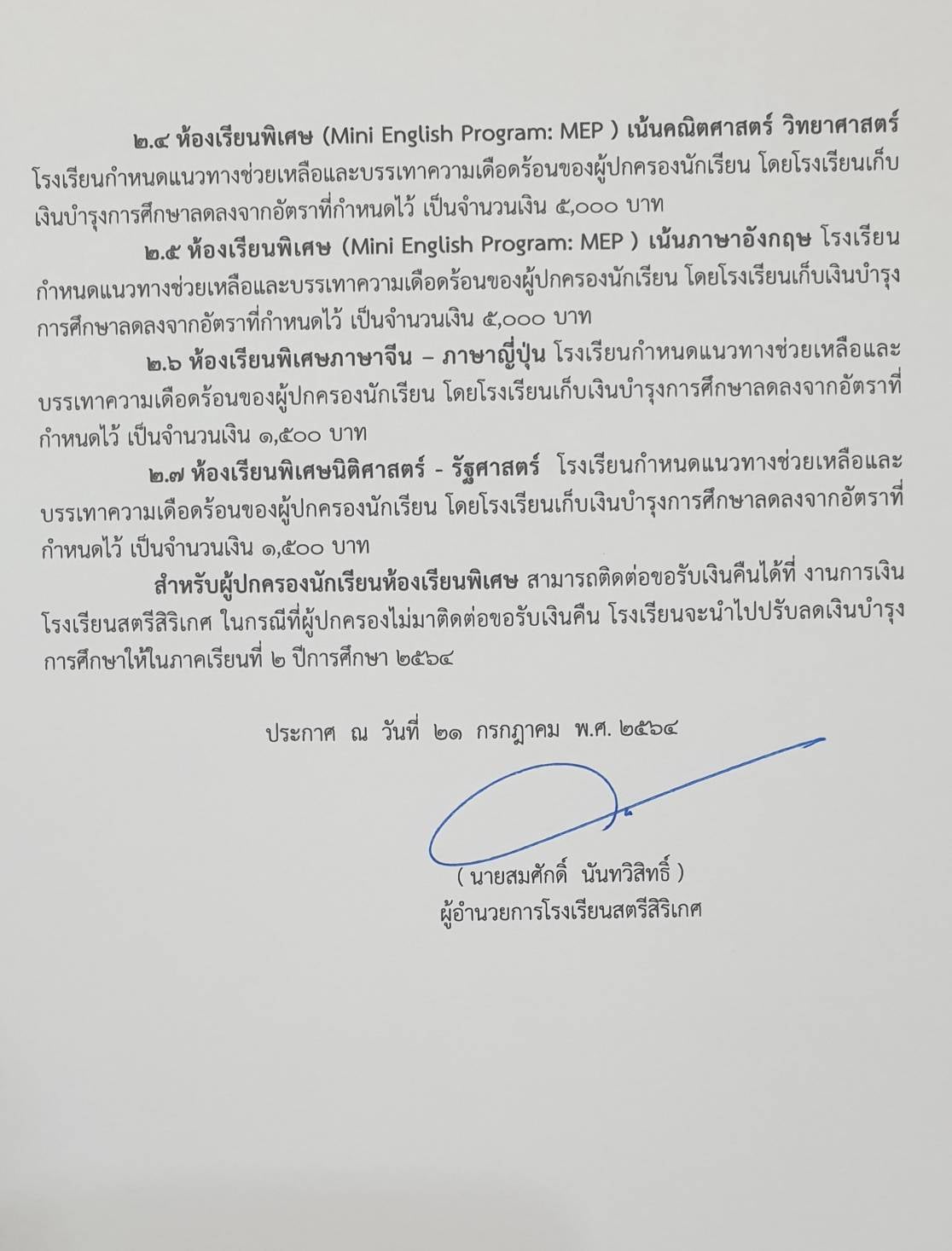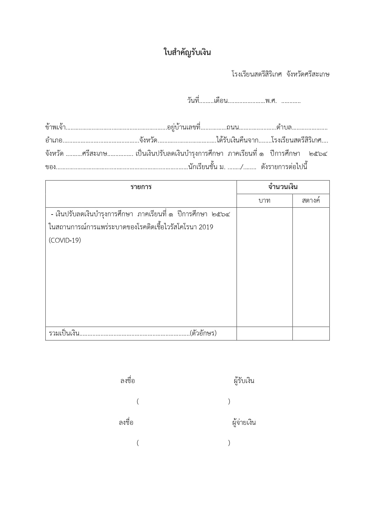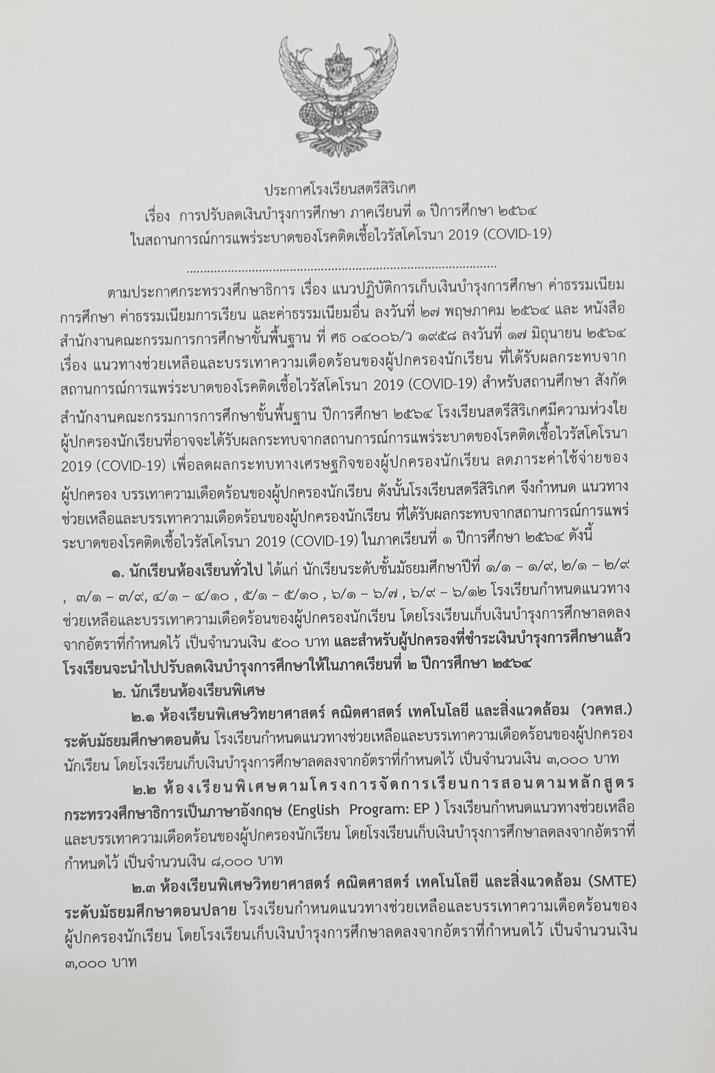 รายละเอียดการเก็บเงินรายได้สถานศึกษาโรงเรียนสตรีสิริเกศ ภาคเรียนที่ 1 ปีการศึกษา 2564