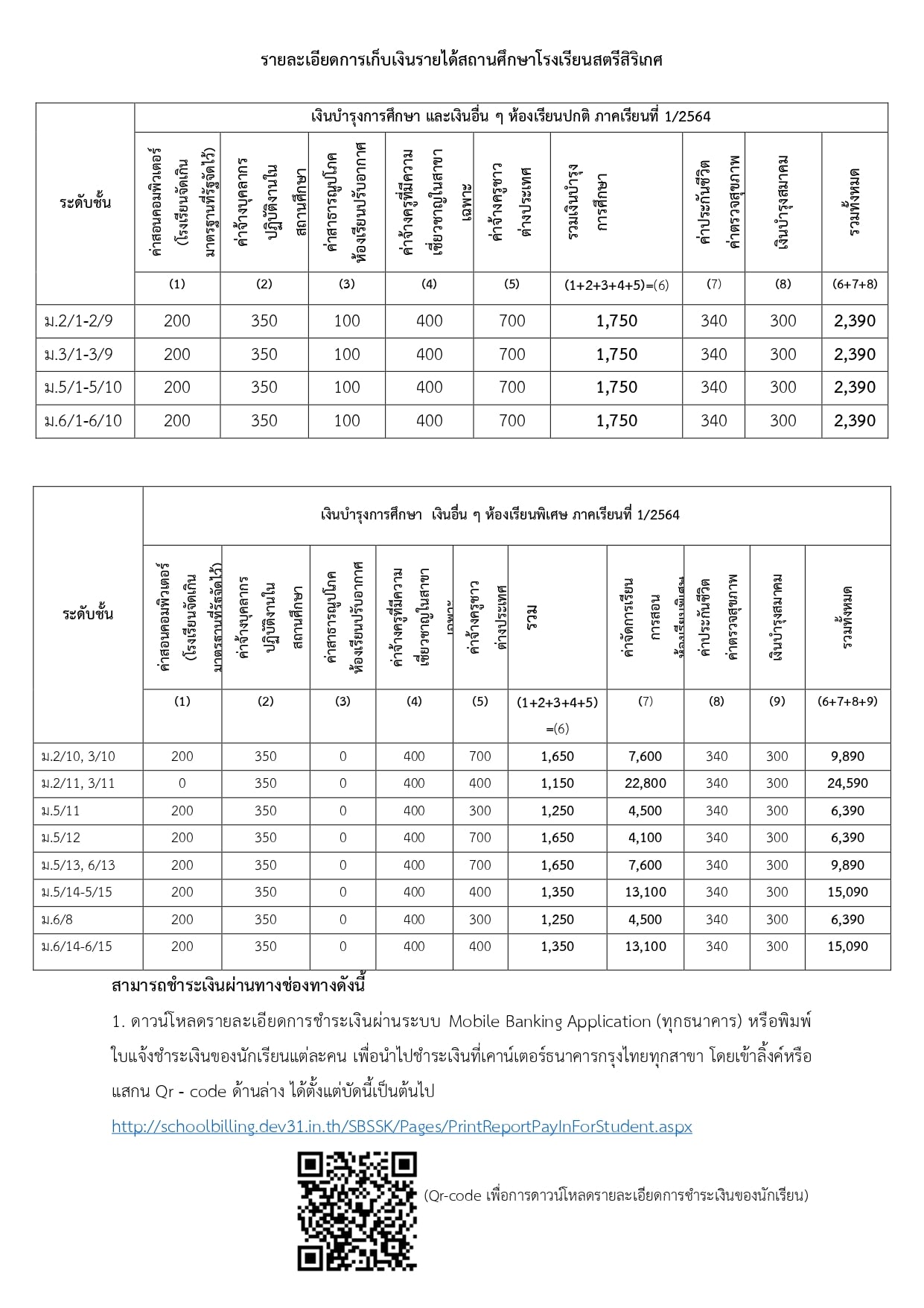 • พิมพ์ ใบแจ้งชำระเงินของนักเรียนแต่ละคน เพื่อนำไปชำระเงินที่เคาน์เตอร์ธนาคารกรุงไทยทุกสาขา โดยเข้าลิ้งค์หรือแสกน Qr – code ด้านล่าง http://schoolbilling.dev31.in.th/SBSSK/Pages/PrintReportPayInForStudent.aspx  ได้ตั้งแต่บัดนี้เป็นต้นไป