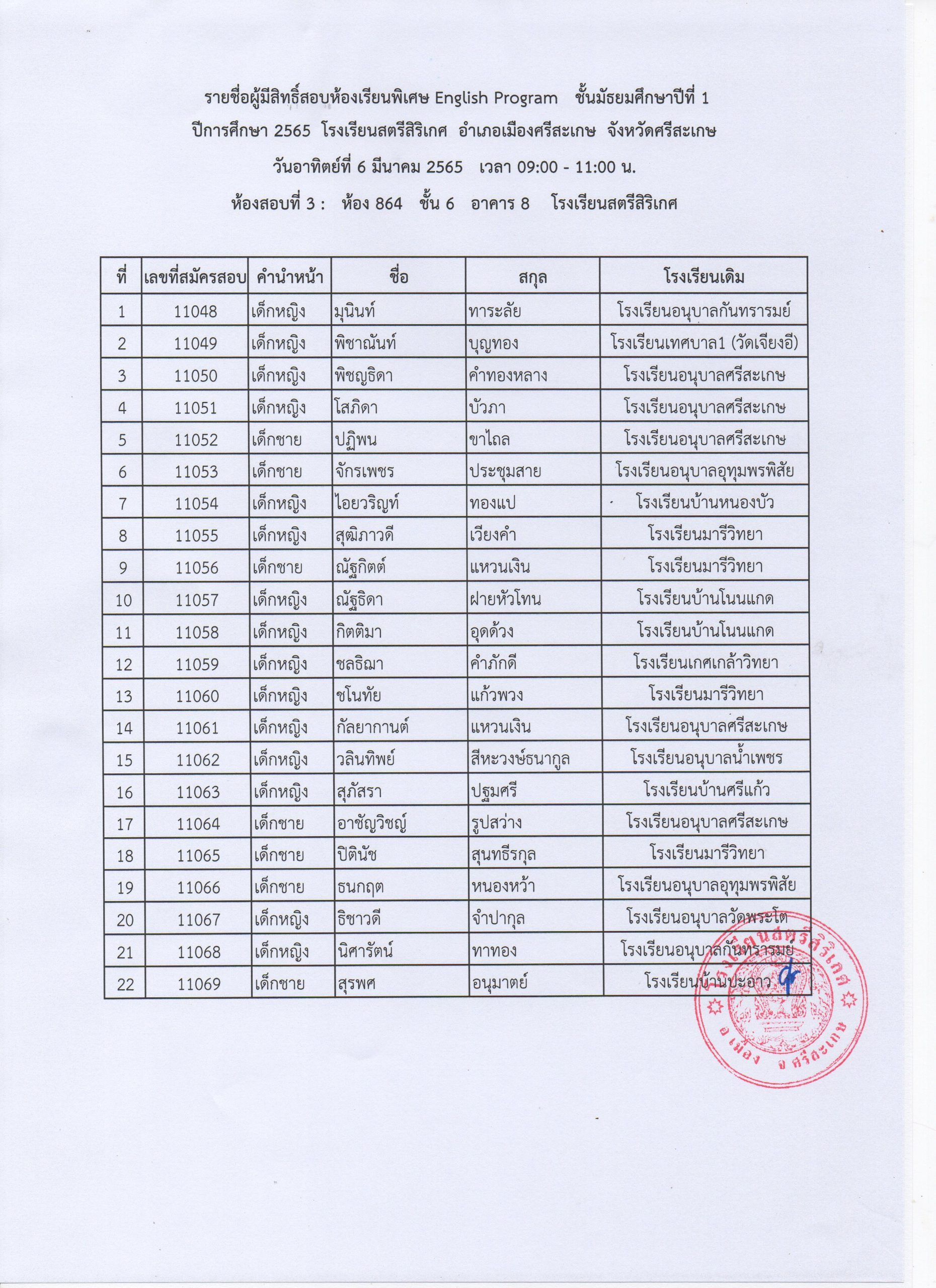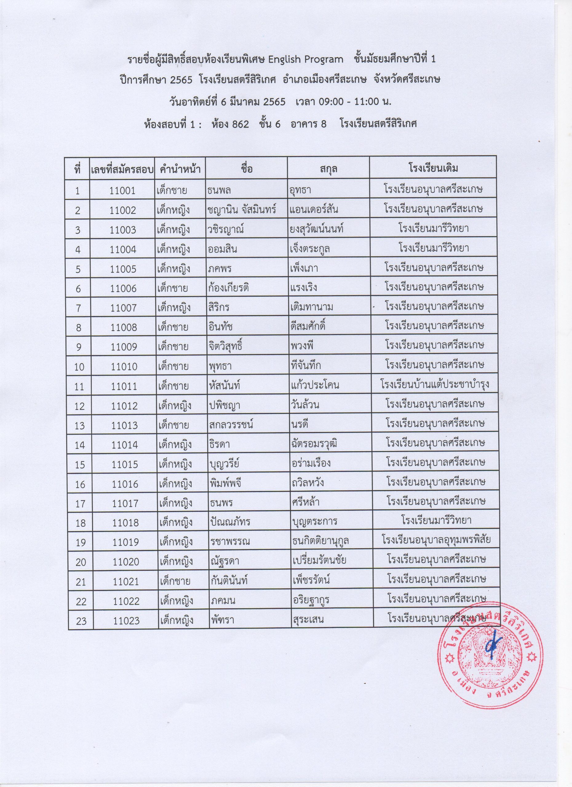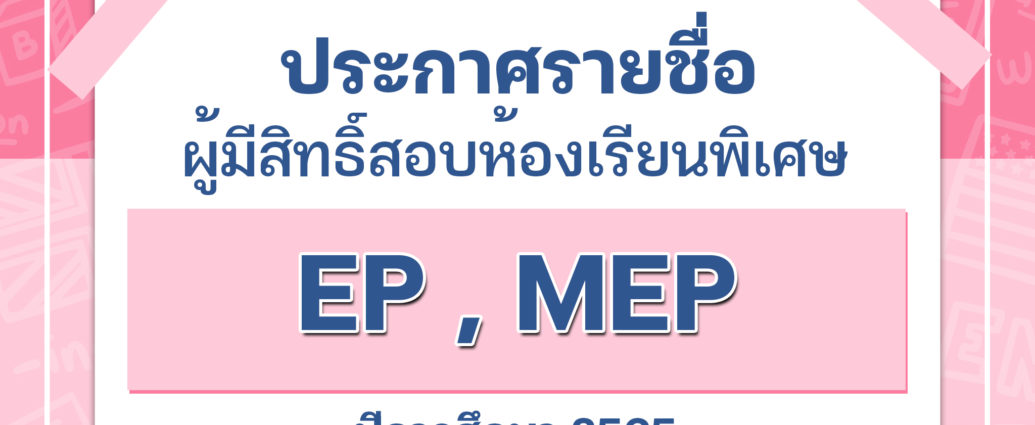ประกาศรายชื่อผู้มีสิทธิ์สอบคัดเลือกเข้าศึกษาต่อระดับชั้น มัธยมศึกษาปีที่ 1 ปีการศึกษา 2565 ห้องเรียนพิเศษ EP