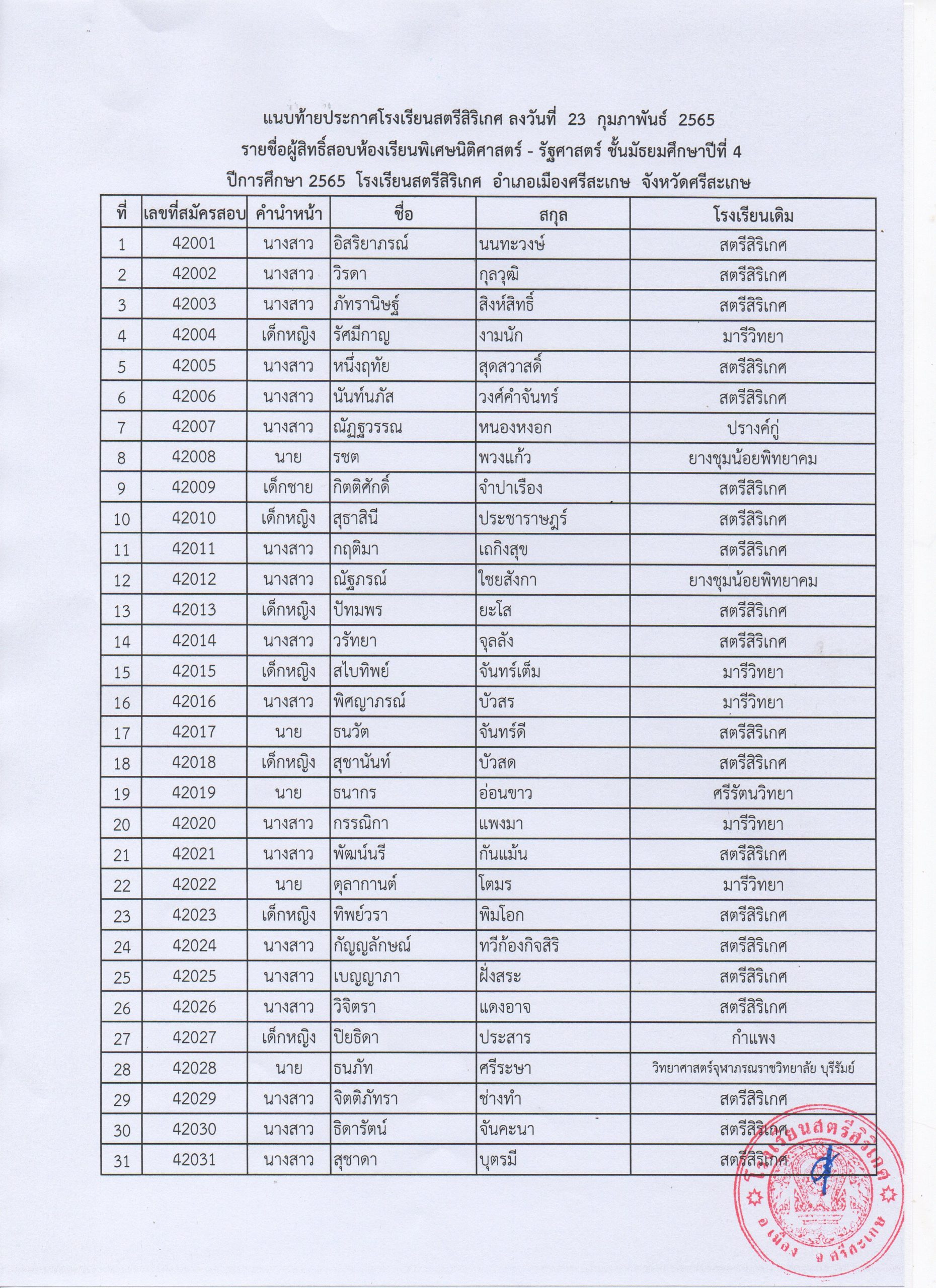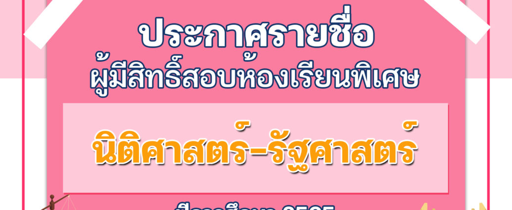 ประกาศรายชื่อผู้มีสิทธิ์สอบคัดเลือกเข้าศึกษาต่อระดับชั้น มัธยมศึกษาปีที่ 4 ปีการศึกษา 2565 ห้องเรียนพิเศษ นิติศาสตร์ รัฐศาสตร์
