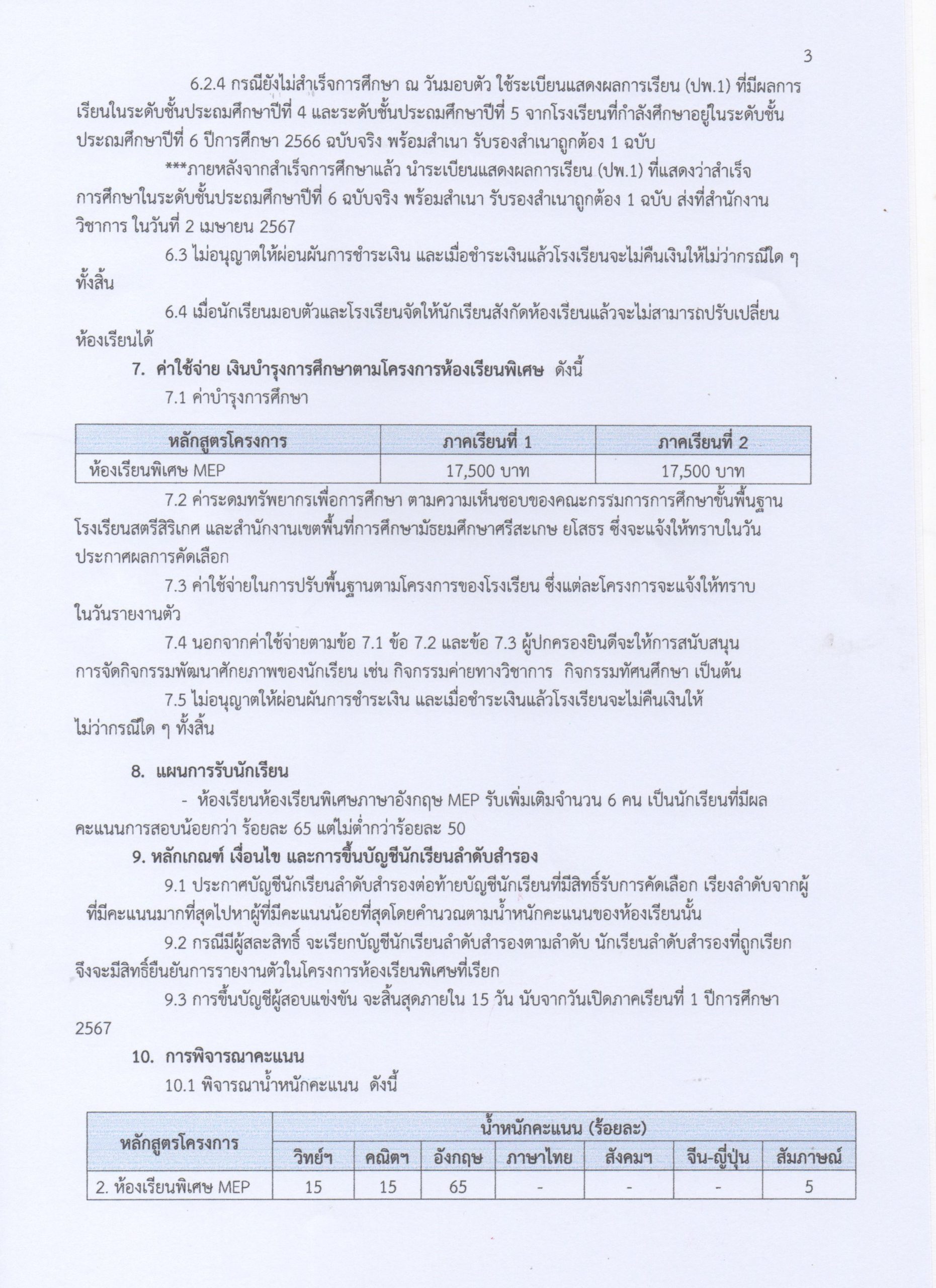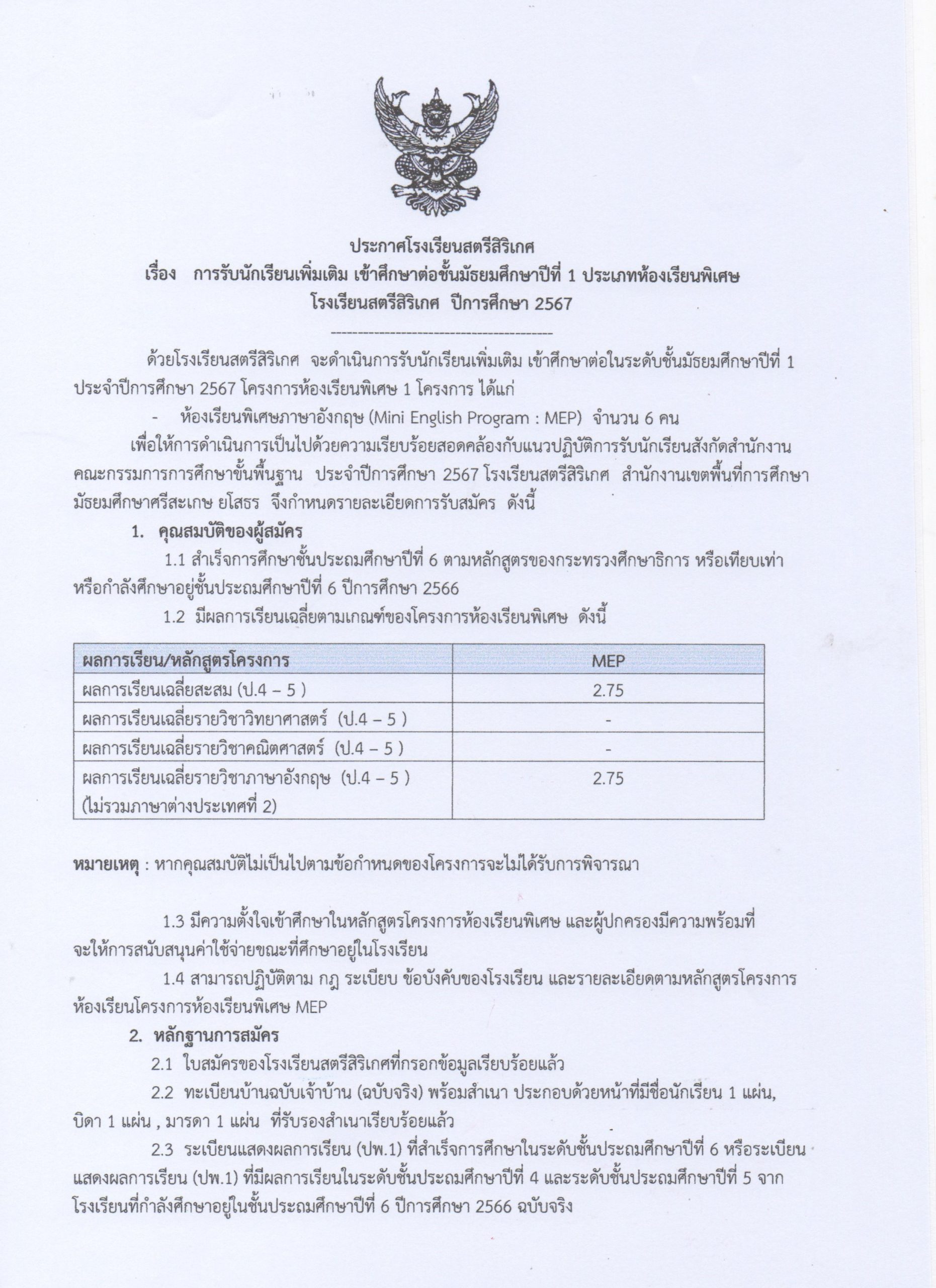 ประกาศรับสมัครนักเรียนเพิ่มเติม ระดับชั้น ม.1 ประเภทห้องเรียนพิเศษ ปีการศึกษา 2567