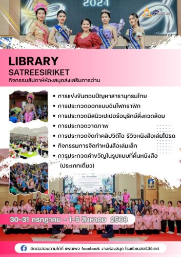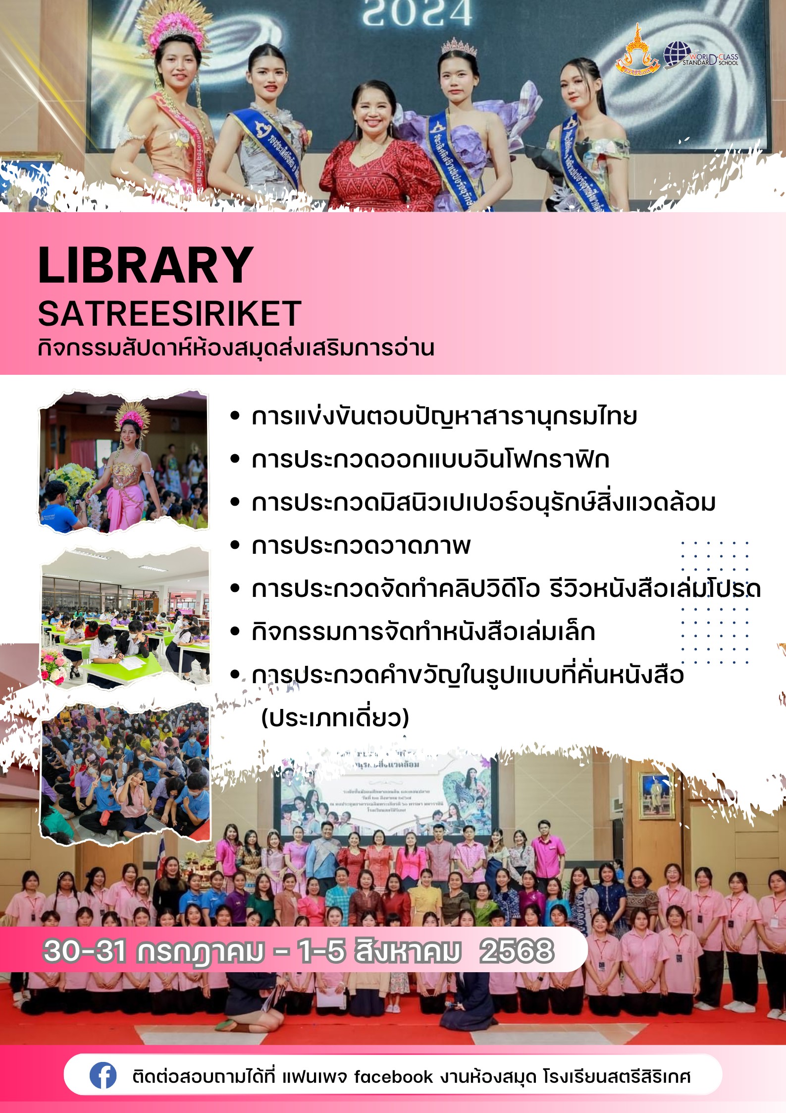 ห้องสมุดโรงเรียนสตรีสิริเกศ เชิญชวนนักเรียนสมัครเข้าแข่งขันและส่งผลงานประกวดเนื่องในกิจกรรมสัปดาห์ห้องสมุดส่งเสริมการอ่าน ปีการศึกษา ๒๕๖๘