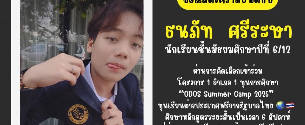 ขอแสดงความยินดีกับ นายธนภัท ศรีระษา นักเรียนชั้นมัธยมศึกษาปีที่ 6/12 ที่ผ่านการคัดเลือกเข้าร่วมโครงการ 1 อำเภอ 1 ทุน “ODOS Summer Camp 2025” ทุนเรียนต่างประเทศฟรีจากรัฐบาลไทย 🇹🇭