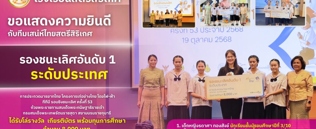 📣 ขอแสดงความยินดีกับทีมเสน่ห์ไทยสตรีสิริเกศ ได้รับรางวัลรองชนะเลิศอันดับ 1 ระดับประเทศ 🎉