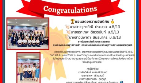 ขอแสดงความยินดีกับนักเรียนคนเก่งที่ได้รับ “รางวัลชนะเลิศถ้วยพระราชทาน สมเด็จพระกนิษฐาธิราชเจ้า กรมสมเด็จพระเทพรัตนสุดาฯ สยามบรมราชกุมารี” ระดับชั้น ม.1-ม.3